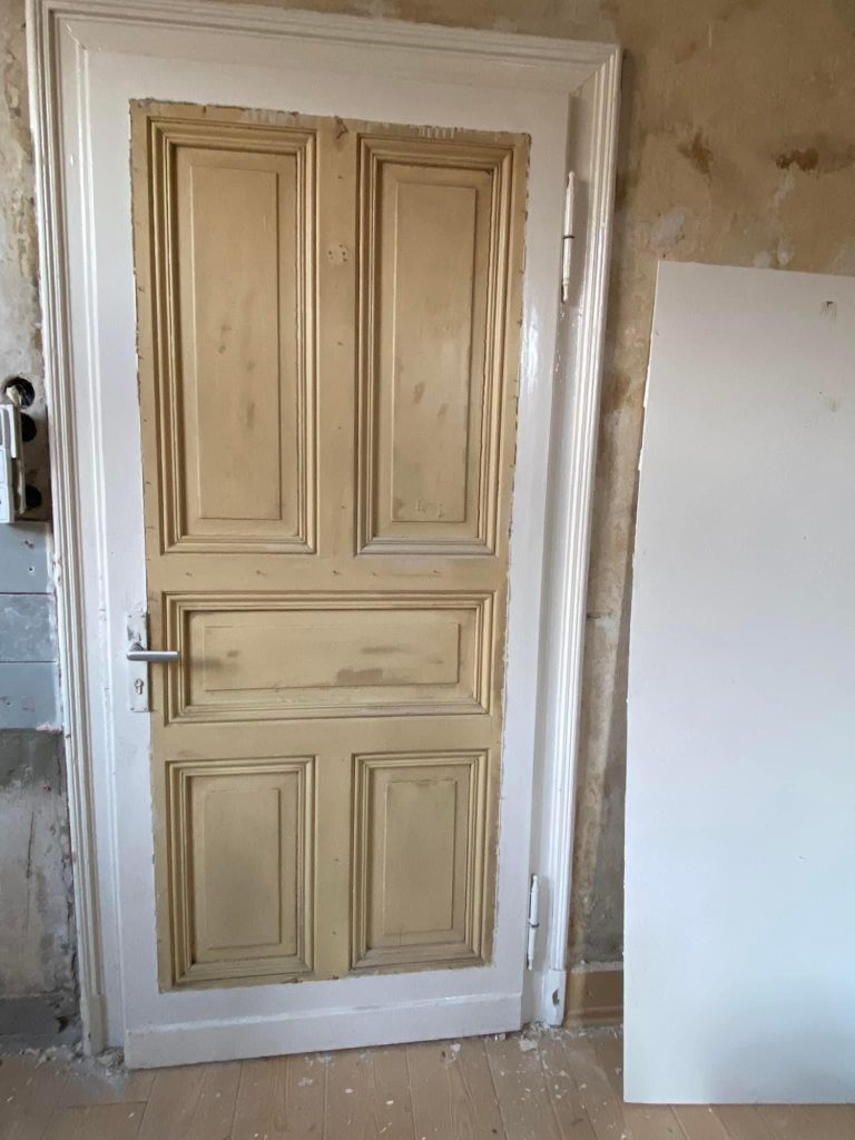 Ganz schön praktisch, wenn man selber Elektriker ist. Julian hat die Elektrik im kompletten Erdgeschoss eigenständig erneuert. Außerdem haben wir im Februar den ganzen Schutt von unseren Abrissarbeiten weggeräumt. Da die Türen beim Anklopfen "hohl" klangen, hatten wir den Verdacht, dass sich darunter etwas verbirgt. Als wir schließlich die großen Platten von den Türen abgenommen haben, entdeckten wir ein wunderschönes Muster, das zum Vorschein kam.