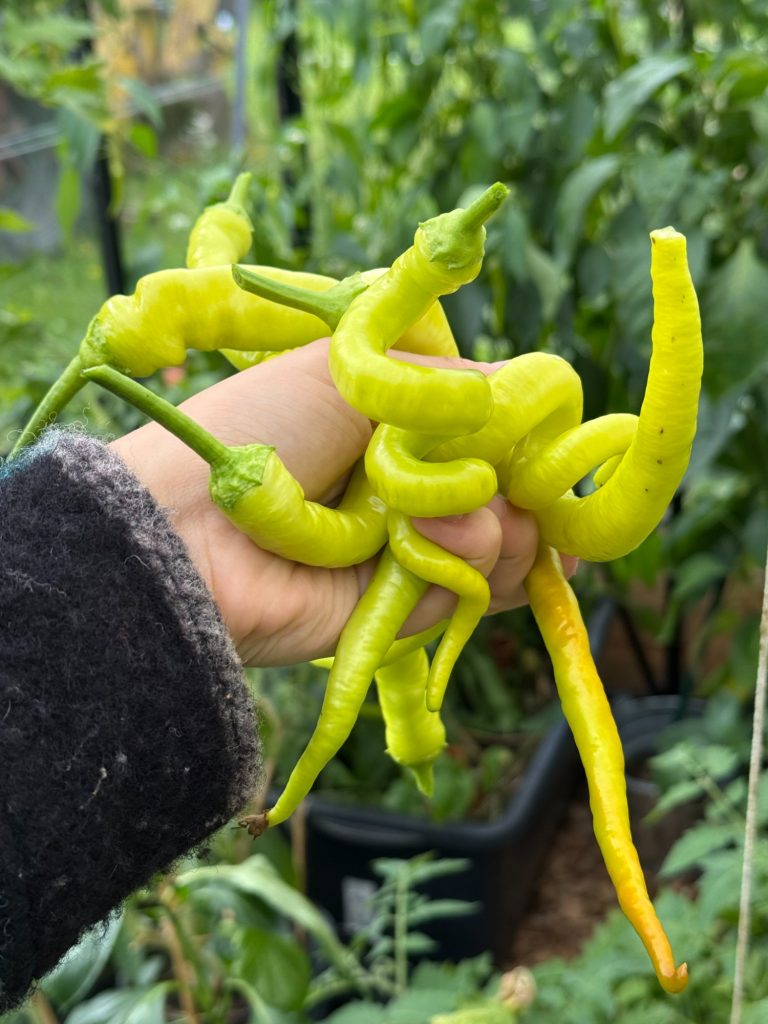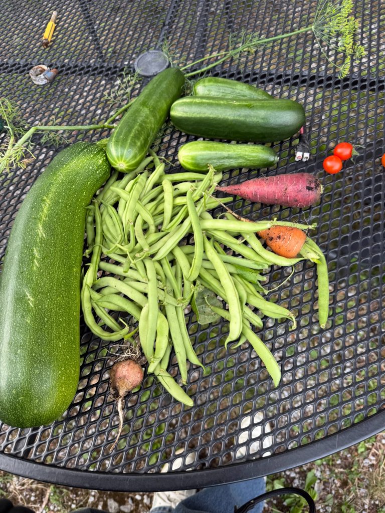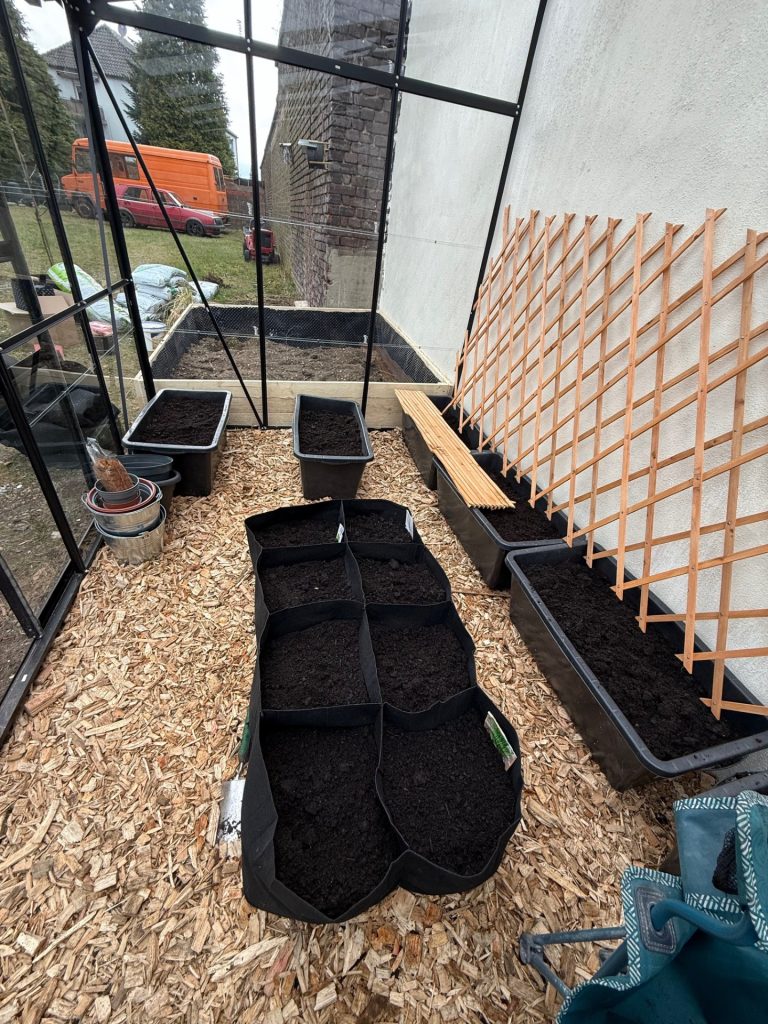 Außerdem haben wir im Laufe des Jahres Gemüse in Mörtelkübel eingepflanzt. In die Kübel haben wir vorher Löcher reingebohrt, damit das Wasser abfließen kann, Erde rein, Gemüse Samen, fertig. Die Kartoffeln haben wir in Kartoffelsäcken gepflanzt. Davon sind im Dezember immer noch welche übrig. Das Gärtnern hat Spaß gemacht und sich richtig gelohnt, sodass wir ein Gewächshaus bestellt haben.