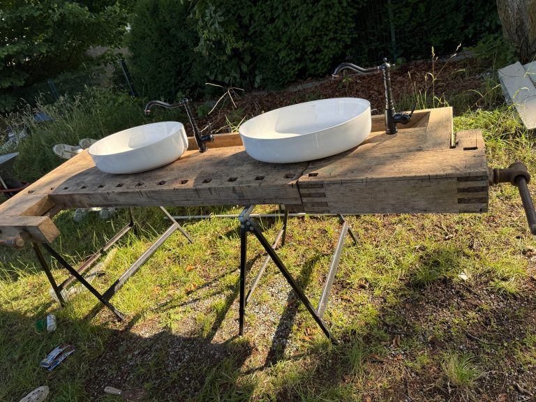 aus einer alten Hobelbank, welche wir günstig bei Kleinanzeigen gekauft haben, soll unser Waschtisch entstehen. Diese haben wir abgeschliffen und damit diese auch Wasserabweisend ist, mit einer Kunstharzschicht versiegelt. Die Wand an der, der Waschtisch gestellt werden soll haben wir auch gefliest. Nebenbei konnten wir immer wieder etwas Geüse ernten.