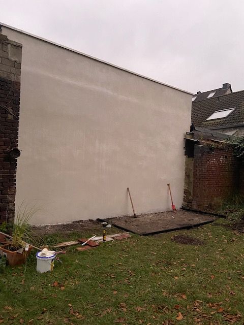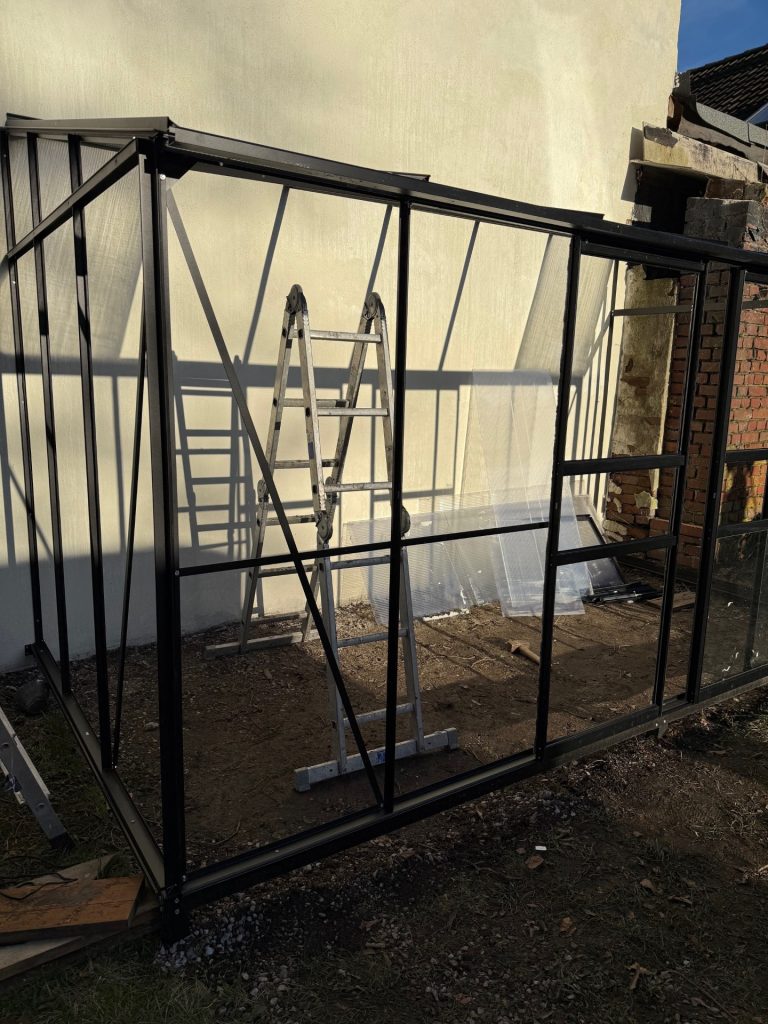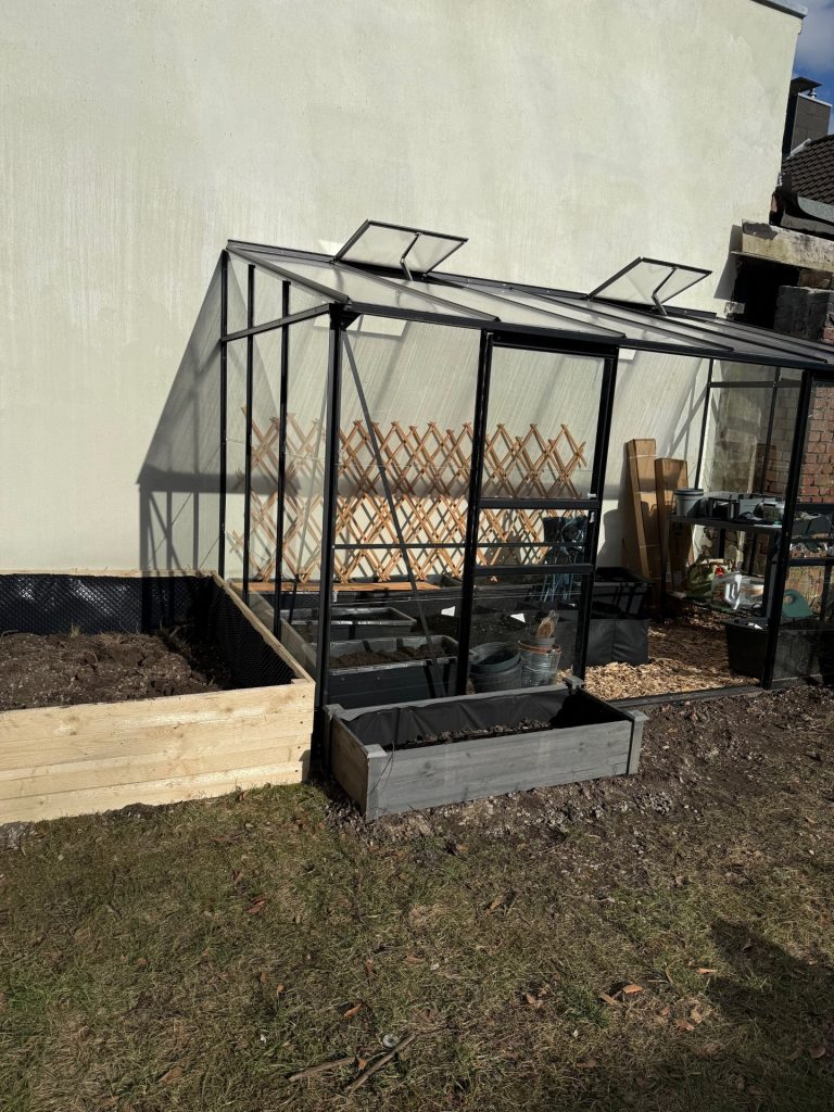 Anfang des Jahres war es verdammt kalt, sodass wir nur die sonnigen Tage nutzen konnten, um etwas zu schaffen. Die Wand hinter dem Gewächshaus wurde verputzt und von uns gestrichen. Dann haben wir angefangen das Gewächshaus aufzubauen.