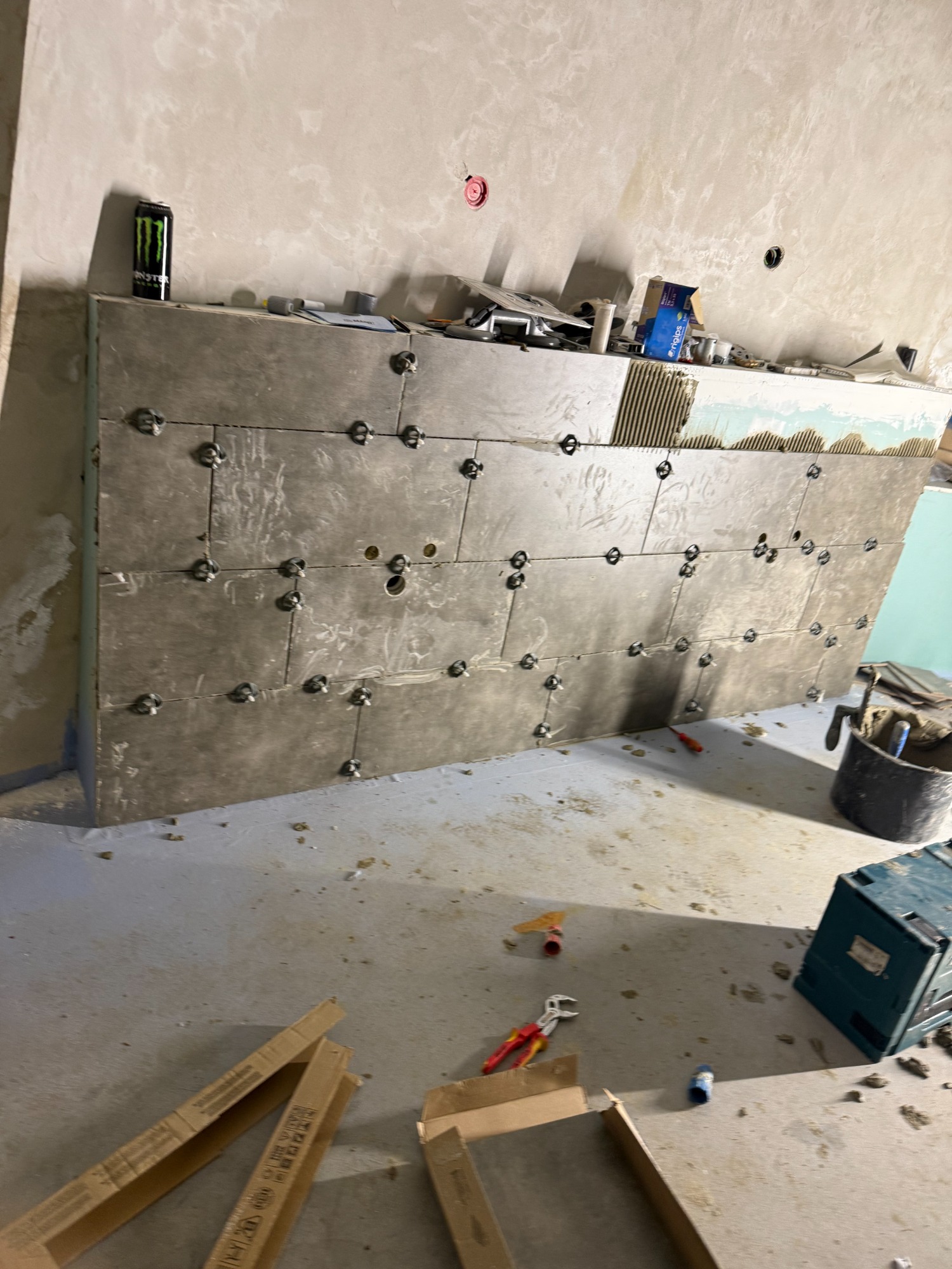 Die wärmeren Temperaturen lassen es zu, dass wir endlich anfangen können das Badezimmer zu fliesen