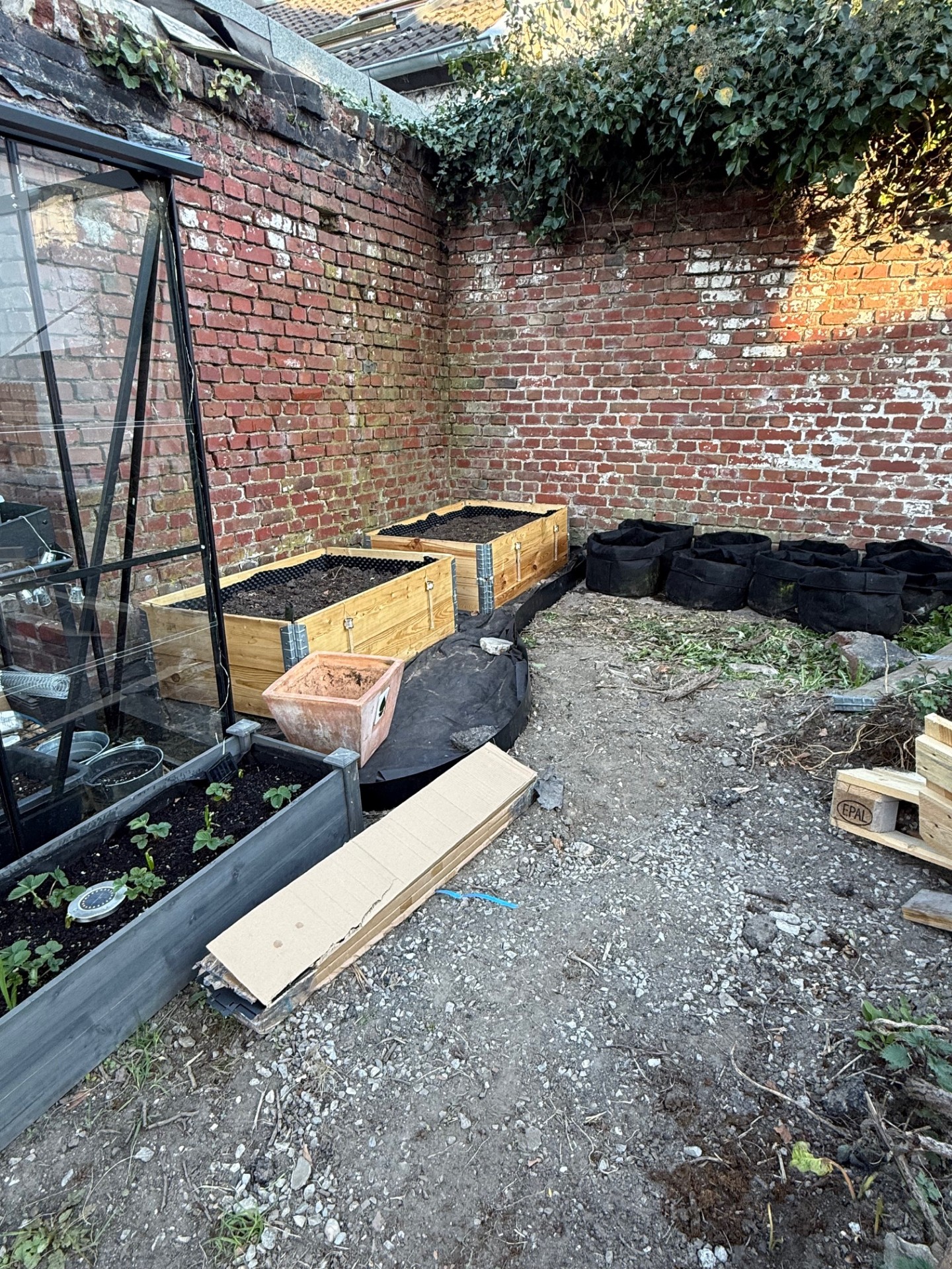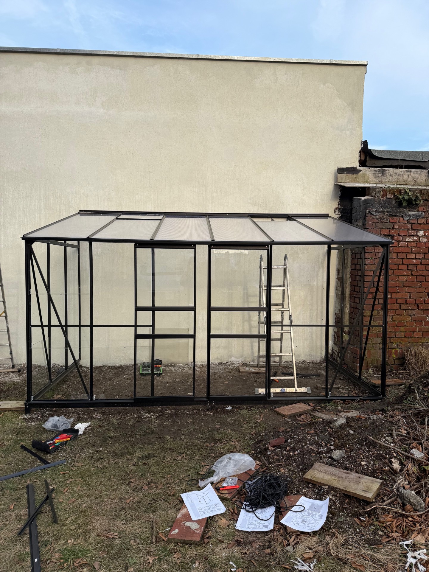 Anfang des Jahres war es verdammt kalt, sodass wir nur die sonnigen Tage nutzen konnten, um etwas zu schaffen. Die Wand hinter dem Gewächshaus wurde verputzt und von uns gestrichen. Dann haben wir angefangen das Gewächshaus aufzubauen.